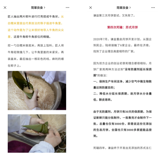 弱化营销感:在带有营销性质的推文里,更多地去描述产品特点、开发产品的心路历程等。比如在米线、月饼、粽子等产品上会花更多篇幅描述寻找产品代工厂的过程,一步步解决零添加问题的真实经历。